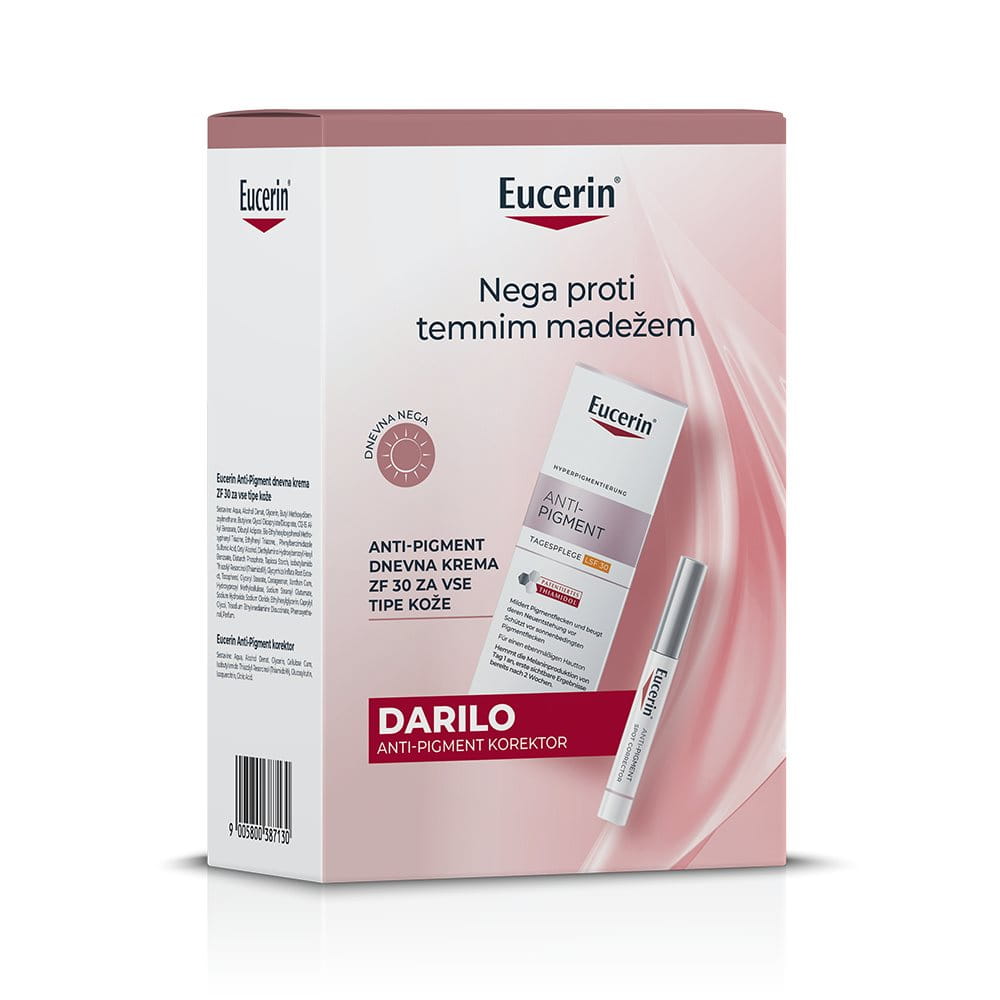 Eucerin Anti-Pigment darilni set vsebuje: Anti-Pigment dnevno kremo ZF 30 - vlažilna dnevna krema, ki vsebuje patentirano sestavino Thiamidol za preprečevanje in zmanjševanje pigmentnih madežev oz. hiperpigmentacije in darilo: Anti-Pigment korektor - s Thiamidolom omogoča natančen nanos na majhna območja hiperpigmentacije. Sonce, hormonski vplivi in staranje lahko povzročijo hiperpigmentacijo: temne madeže in starostne pege (imenovane tudi sončne pege), ki koži dajejo neenakomeren videz. Linija Eucerin Anti-Pigment je bila posebej zasnovana za zmanjšanje hiperpigmentacije za enakomernejšo in sijočo kožo. Prvi rezultati so vidni po dveh tednih in se z redno uporabo stalno izboljšujejo.