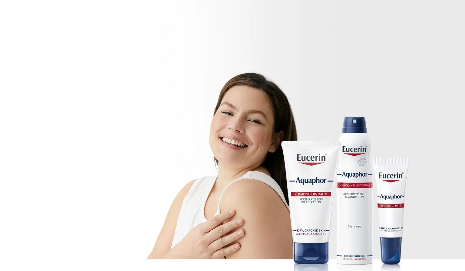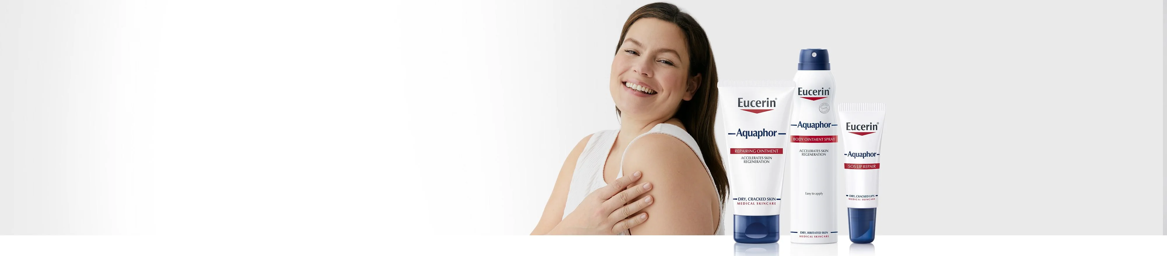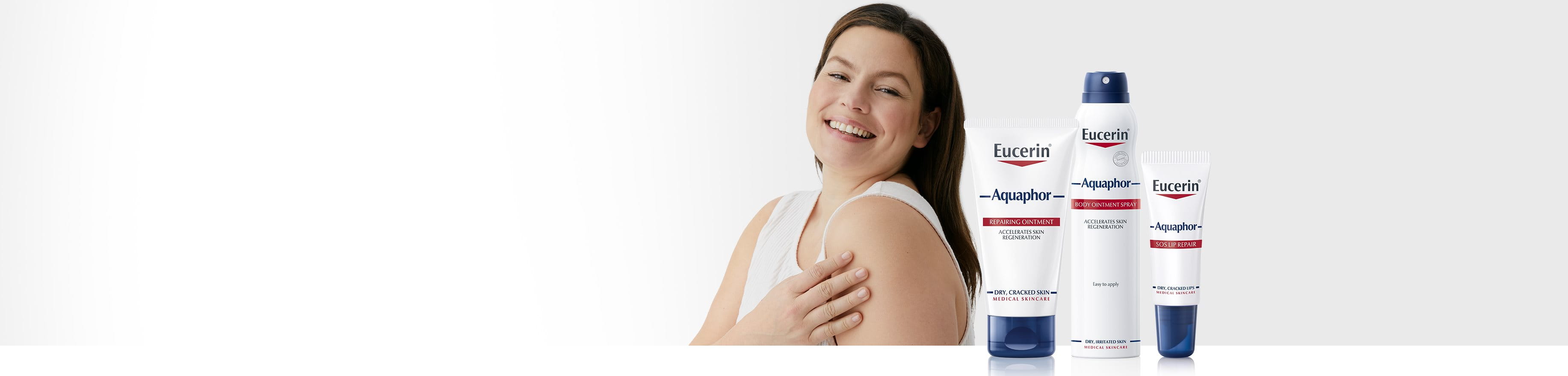 Eucerin Aquaphor obnovitveno mazilo oskrbi zelo suho in razdraženo kožo z nego za prvo pomoč, ki jo potrebuje. Na koži tvori delno okluzivno zaščitno bariero, ki spodbuja naravni prenos vodne pare in kisika v kožo in iz nje, kar koži omogoča, da »diha«, in okrepi njeno naravno funkcijo bariere. Glicerin v formuli je učinkovita vlažilna sestavina, ki privlači vodo in jo pomaga zadržati v koži. Deluje skupaj s pantenolom, ki pomaga pospešiti regeneracijo in obnovitev kože, obenem pa jo tudi vlaži.