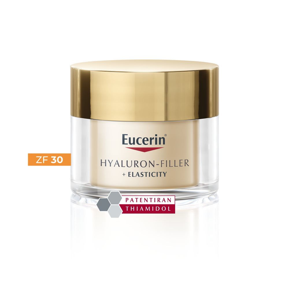 Da. Eucerin Hyaluron-Filler + Elasticity dnevna krema ZF 30 je zasnovana tudi za potrebe zrele kože – zapolni globoke gube, izboljša prožnost in zmanjša starostne pege, da je koža na otip čvrsta in na pogled sveža in bolj sijoča.