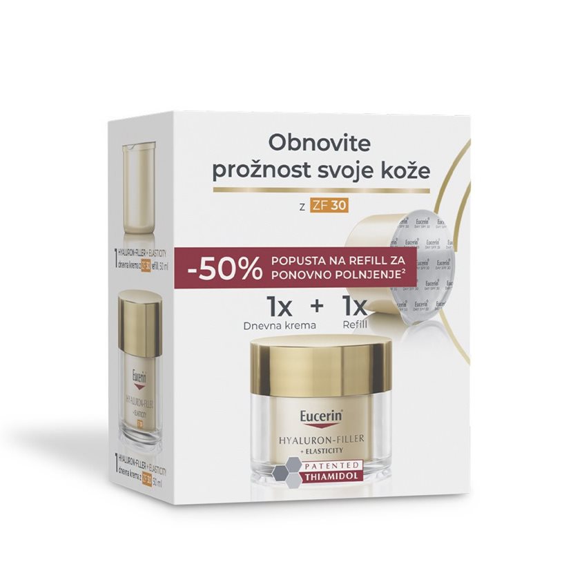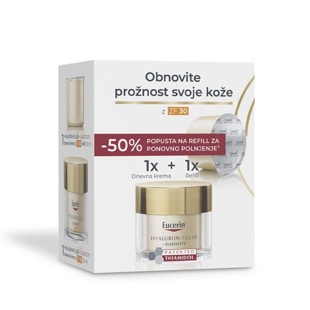 Anti-age dnevna krema za kožo, na kateri so vidni zgodnji in že razviti znaki staranja. Eucerin Hyaluron-Filler + Elasticity dnevna krema ZF 30 je anti-age dnevna krema, ki izboljša prožnost kože, zapolni globoke gube in zmanjša temne madeže. Edinstvena formula ima številne anti-age učinke. Novi kolagensko-elastinski kompleks, učinkovita kombinacija arctiina in kreatina, spodbudi tvorbo kolagena in izboljša prožnost kože. Eucerinov patentirani Thiamidol zmanjša izrazitost temnih madežev. Eucerinova inovativna kombinacija visoko- in nizkomolekularne hialuronske kisline vidno zapolni globoke gube. Za kožo, ki je bolj gladka in sijoča ter vidno mladostnejša. Dnevna krema vsebuje tudi ZF 30 in UVA-filter, da učinkovito preprečuje prezgodnje staranje kože in poglabljanje gub, ki ju povzroča UV-sevanje.