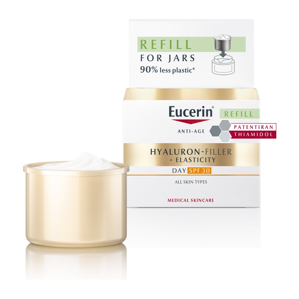 Ta vložek za ponovno polnjenje HYALURON-FILLER + ELASTICITY dnevne kreme ZF 30 vsebuje za 90 % manj plastike kot običajni lonček Eucerinove kreme za obraz. Z uporabo tega vložka za ponovno polnjenje lahko pomagate zmanjšati količino plastičnih odpadkov in prispevate k bolj trajnostnemu življenjskemu krogu izdelka. Združljiv z vsemi lončki Eucerinovih krem za obraz