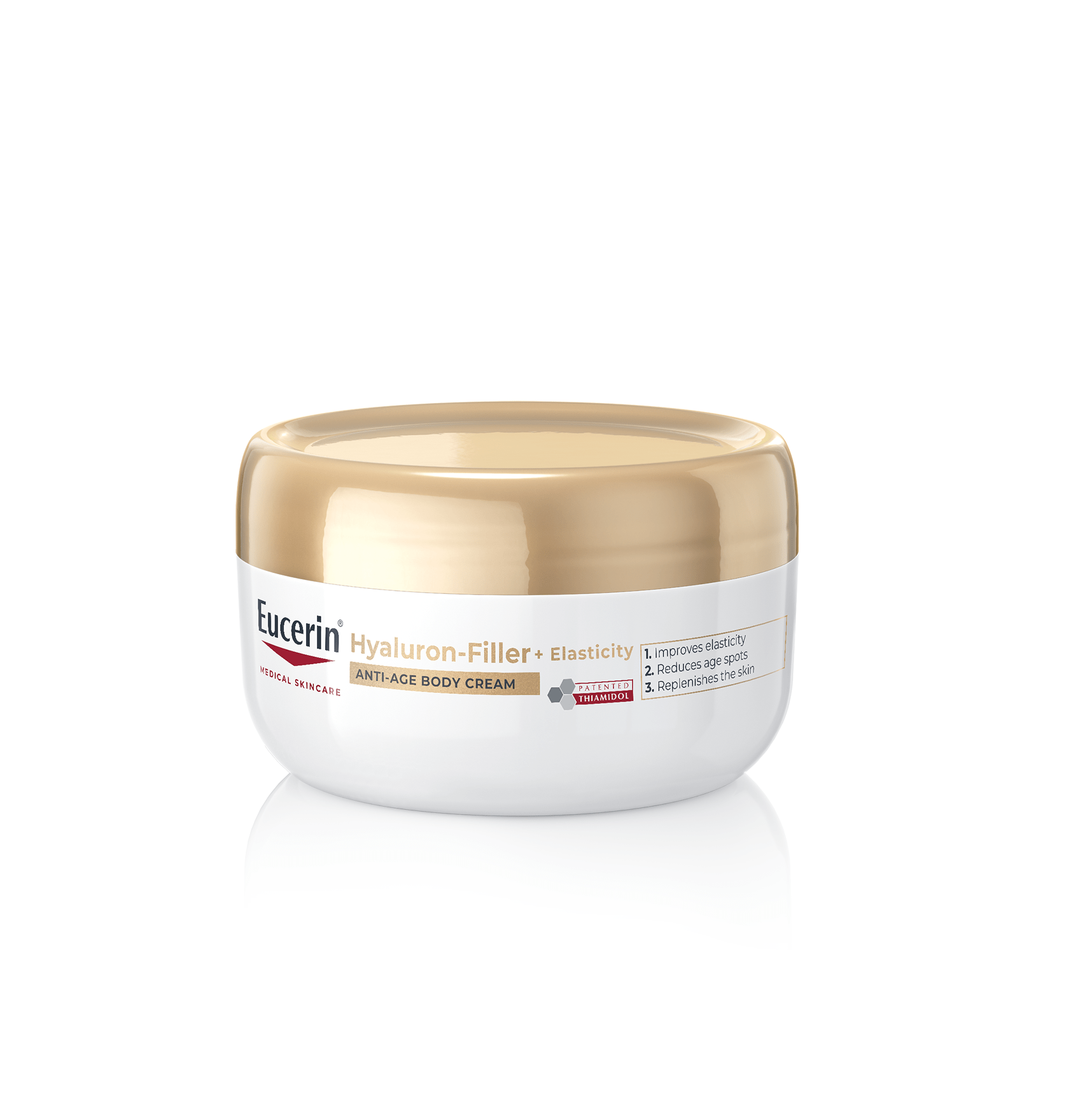 Eucerin Hyaluron Filler + Elasticity anti-age krema za telo je anti-age dnevna krema, ki izboljša prožnost, zmanjša starostne pege in nahrani kožo.