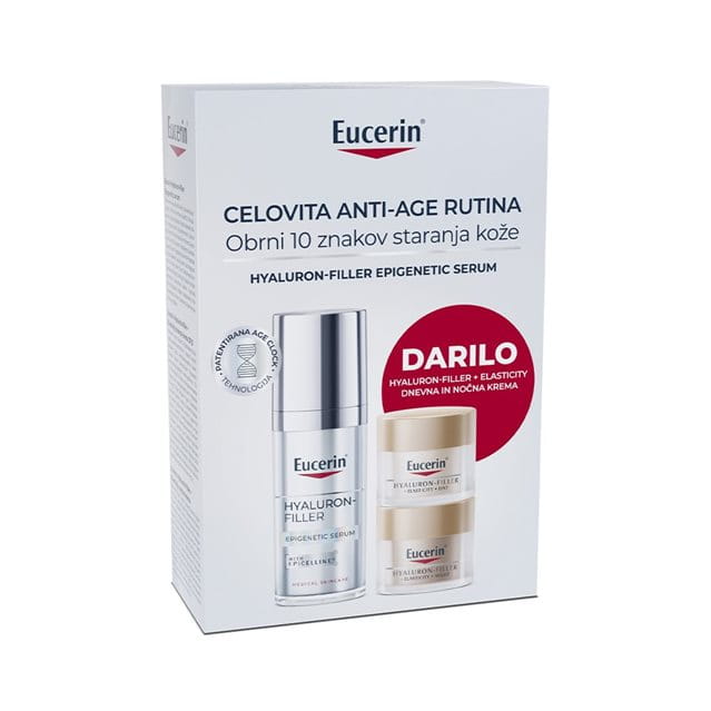 Celovita anti-age rutina vsebuje Eucerin Hyaluron-Filler Epigenetic serum z aktivno sestavino Epicelline® ki reaktivira gene mladosti kože pri izvoru in omogoča, da kožne celice delujejo mlajše. Ta mehanizem poskrbi, da je koža videti mlajša od njene dejanske starosti, obenem pa obrne 10 znakov staranja. Paket vsebuje tudi DARILO - Eucerin Hyaluron-Filler + Elasticity dnevno kremo ZF 15 in Hyaluron-Filler + Elasticity nočno kremo, 20 ml, ki zapolnita globoke gube, izboljšata prožnost kože in ublažita starostne pege. Njuna edinstvena formula ima številne anti-age učinke. Eucerinova inovativna kombinacija visoko- in nizkomolekularne hialuronske kisline vidno zapolni globoke gube. Novi kolagensko-elastinski kompleks, učinkovita kombinacija arctiina in kreatina, spodbudi tvorbo kolagena in izboljša prožnost kože. Eucerinov patentirani Thiamidol zmanjša vidnost starostnih peg.