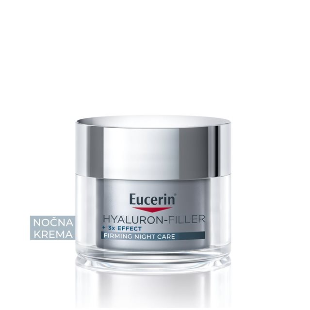 Koža z leti izgublja čvrstost in navlaženost, kar povzroči nastanek globokih gub in počasnejšo regeneracijo. Nočna krema za kožo, ki se stara, mora spodbujati nočno obnavljanje, globinsko navlažiti kožo in obenem pomagati zmanjšati vidne gube. Eucerin Hyaluron-Filler nočna krema združuje visoko- in nizkomolekularno hialuronsko kislino z glicin saponinom, da vidno napne kožo in spodbudi nočno regeneracijo kože.