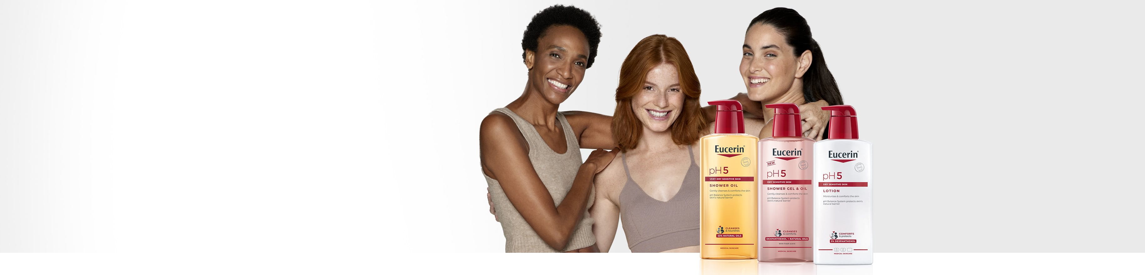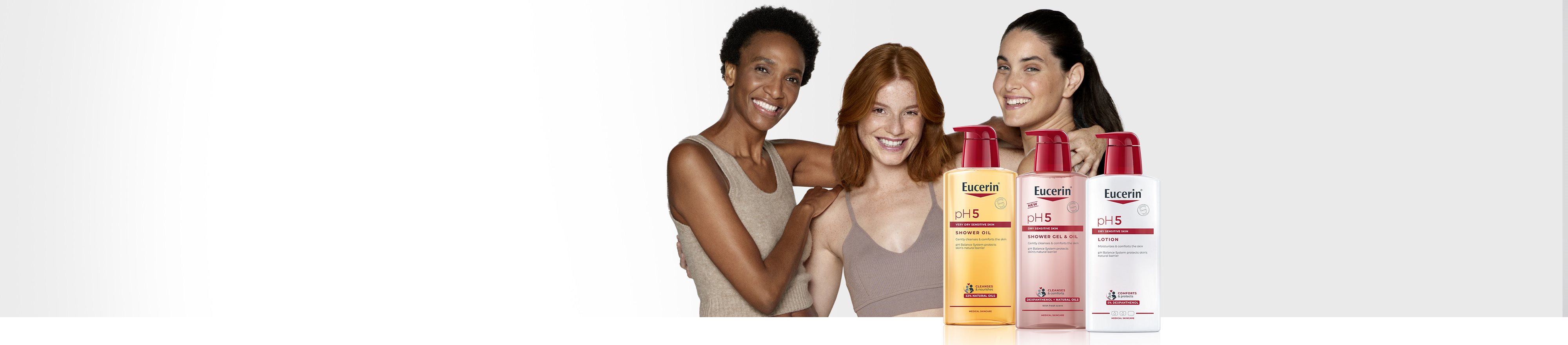 Eucerin pH5 je celovita linija izdelkov, ki so bili posebej razviti za izpolnjevanje potreb suhe občutljive kože. Edinstveni sistem za pH-ravnovesje znamke Eucerin obnovi optimalno pH-vrednost kože in okrepi naravne obrambne mehanizme, da koža postane odpornejša proti okoljskim sprožilcem in manj občutljiva. Mnogi izdelki vsebujejo tudi dekspantenol, ki je znan po svojih obnovitvenih lastnostih.