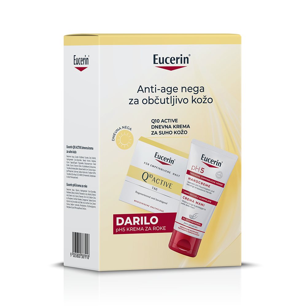 Eucerin darilni set - Q10 Active nega za občutljivo kožo vsebuje Q10 Active dnevno kremo za suho kožo z učinkom proti oksidativnemu stresu razbremeni kožo, obenem pa ji povrne energijo, tako da izboljša metabolizem kože, s čimer poživi kožo za opazno mladostnejši in čvrstejši videz ter zglajene linije in gube in darilo pH5 kremo za roke obogateno s 5 % dekspantenola, pomiri in naravno navlaži kožo ter ji tako zagotovi takojšnje ugodje.
